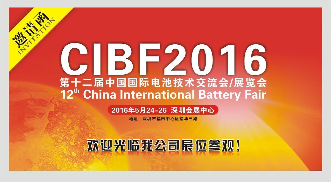 ? ? ? ?2016年5月24日-26日 ?第十二屆中國國際電池技術(shù)交流會/展覽會將在深圳市福田中心區(qū)福華三路,深圳會展中心召開,我司展位號:9F90號,歡迎廣大新老客戶,到我公司展位區(qū)域了解新產(chǎn)品和行業(yè)技術(shù)交流。